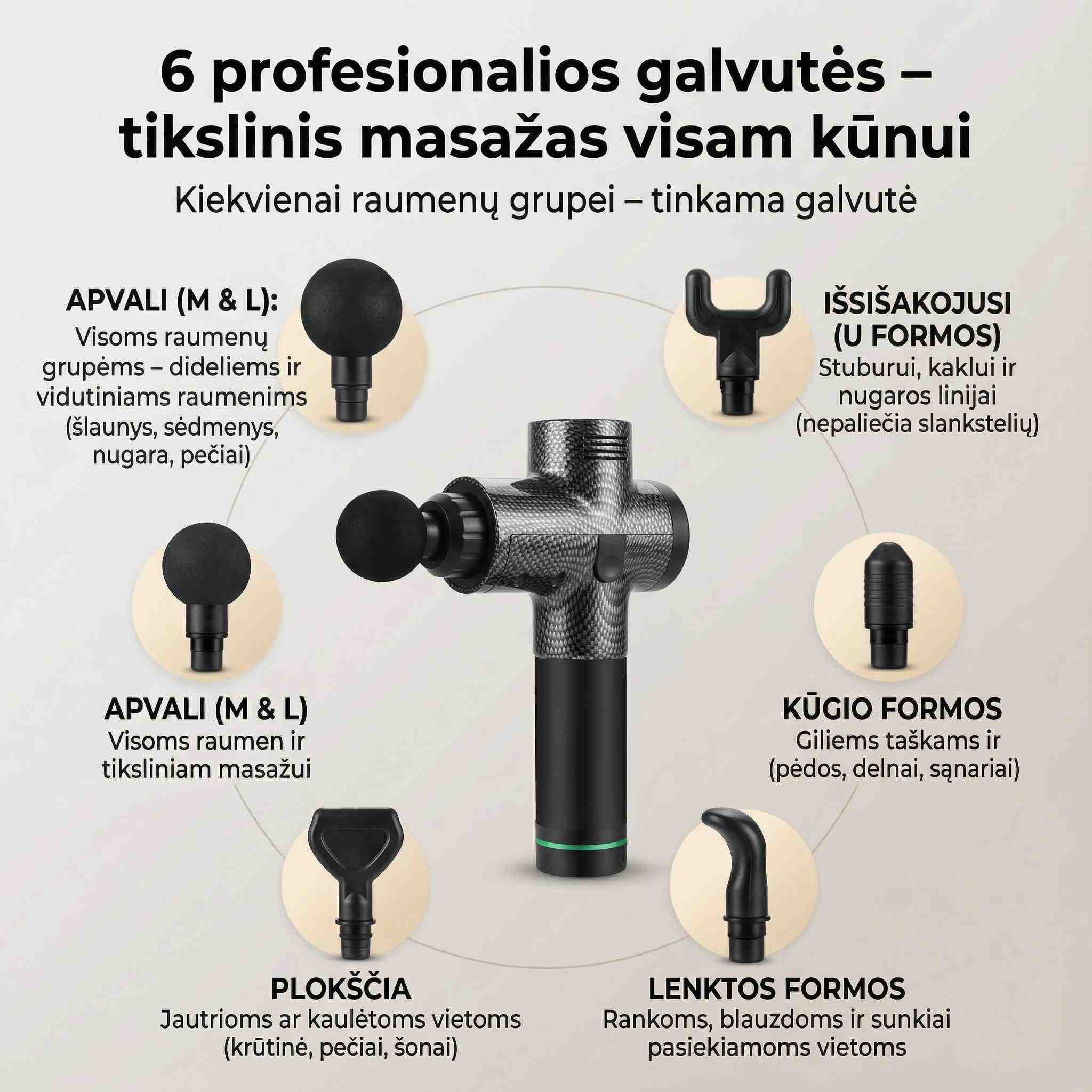 Kiekviena galvutė sukurta specifinėms raumenų grupėms ir masažo technikoms